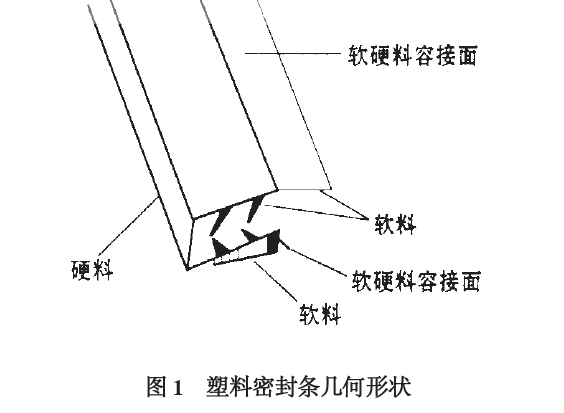 塑料密封條幾何形狀如圖1 所示,分為軟料部分(以熱塑性彈性體為主) 和硬料部分(ABS/PVC 共混物) 。硬料U 形槽內用于固定玻璃,外端固定在汽車門窗框上,軟料部分則對玻璃起減振和密封作用。汽車用塑料密封條技術指標如表1 所列。